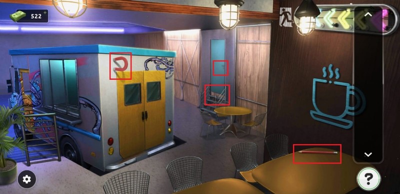 小さなオブジェクトを見つけるために、いつでもズームインおよびズームアウトできることに注意してください。今度は、バールを見つけることが目的のレストランにいます。