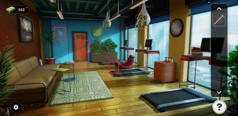 - ドアに向かうと、左側にある絵を発見します。絵をタップして壊れた場所を明らかにし、ハンマーを使用してさらに損傷させます。そこから鍵を受け取り、それを使ってドアのロックを解除し、脱出してください。