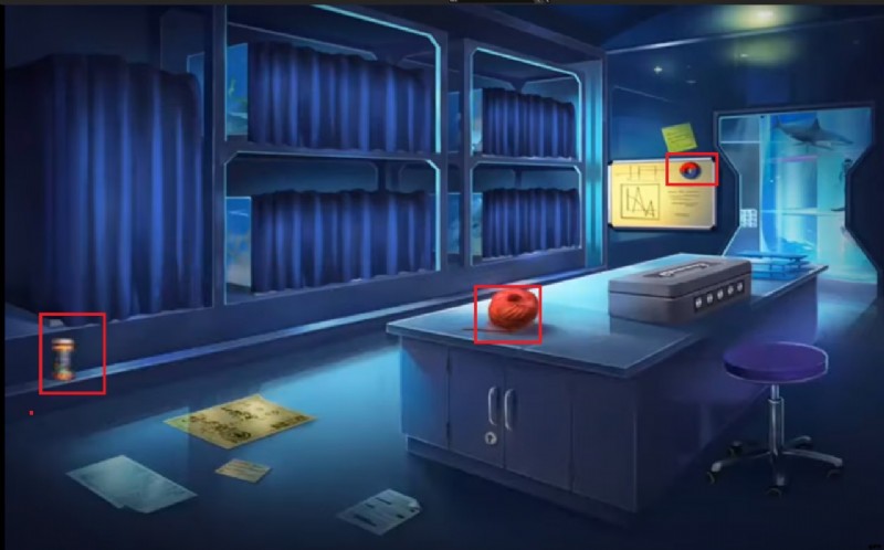 - ドアをくぐると魚の部屋にたどり着きます。そこでは、さらに多くのオブジェクトと手がかりが見つかります。