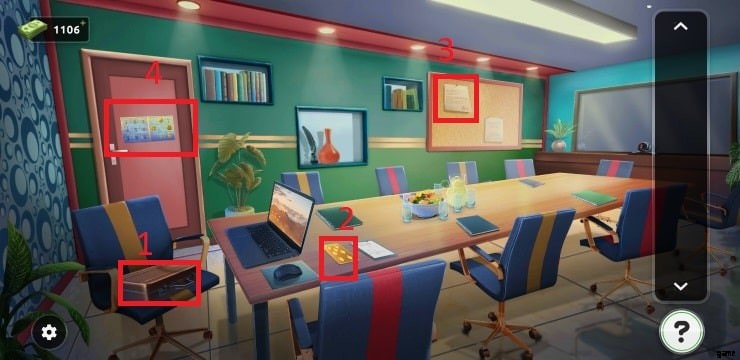 あなたは今、テーブルとたくさんの椅子が用意された会議室にいます。あなたの最終的な目標は、隠されたオブジェクトを発見し、それらを利用してドアのロックを解除し、脱出することです.