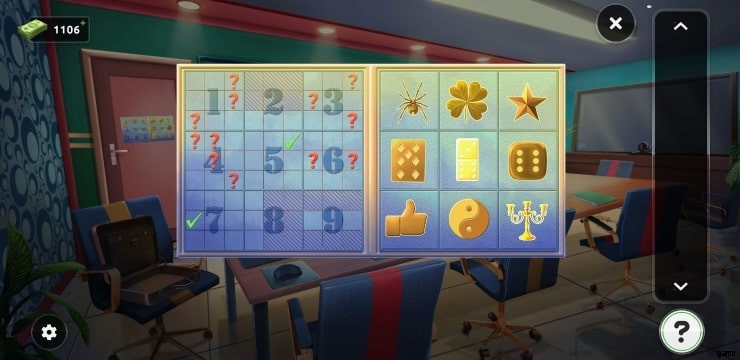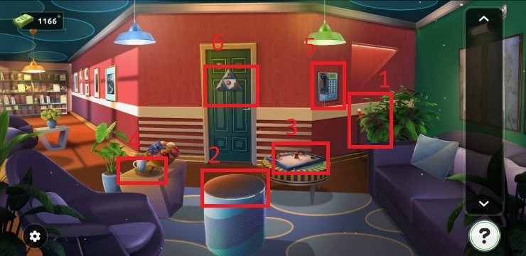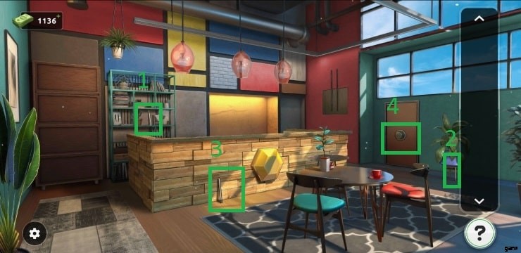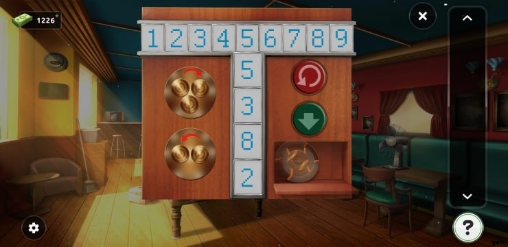 - 扇風機の近くにあるボックスをタップし、両方のボタンをそこに固定してパズルを解いてください。パズルを解くには、次の数字を指定された順序で並べる必要があります 2835 .ボックスからアイテムを集めてドアの上に置き、ミニゲームをプレイし、パズルを解いて部屋を出ます。