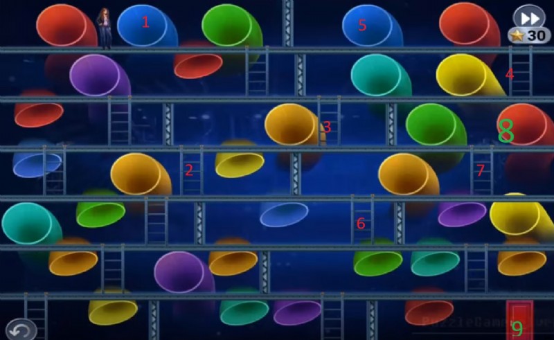 - ドアをくぐると、はしごやスライダーを使って上り下りして出口にたどり着くというパズルに直面するかもしれません。指示に従ってください:ブルー スライド、ラダー アップ 3x、ブルー スライド、ラダー アップ 2x、レッド スライド