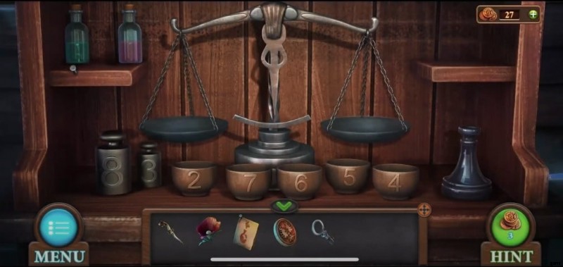 - 魔法のインクを手に入れるには、何としても解決しなければならない複雑なパズルです。謎解きは、インクのレシピを読んで、ウェイトマシンをうまく使ってはじめて可能になります。 2、7、6、5、4 などの数字が印刷された 5 つの空のボウルがあります。目的は、Green などの前述の材料でそれらを満たすことです。 (2)、ピンク (7)、青 (6)、オレンジ (5)、薄緑 (4)。色の後の数字はボウルを表します。