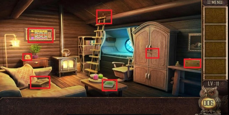 - クッションの後ろにあるタンスをタップして巻物を見つけ、ソファの横のテーブルをタップして本を集めましょう。