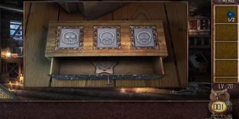- では、右側のキャビネットをタップして、ボードに小さな頭蓋骨を 2 つ配置し、ミニゲームを実行して電球を手に入れましょう。