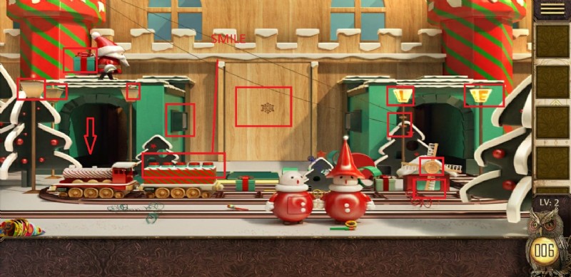 - おもちゃが降りてくると、「メリー クリスマス」と言います。ギフトボックスを開いてオブジェクトを取得します。出口のドアを開ける必要があります。
