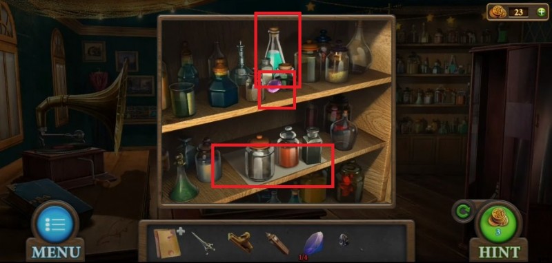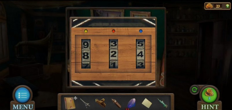 - アンティーク ショップを出て右側の部屋に移動し、鍵を選択して使用します 食器棚のロックを解除するには 入り口でミニゲームをプレイ .