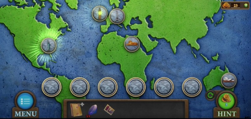 - ゲームには世界地図といくつかのボタンと画像が表示されます。世界地図のパズルを解くと開く秘密の扉から、4 つ目のラミ クリスタルとブラシを集めましょう。