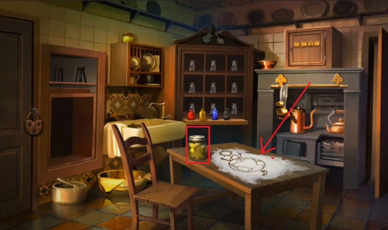 - ピクルスの瓶を集める テーブルから インベントリに追加します。トップダウンの視点から表を見て、いくつかの兆候を確認してください。