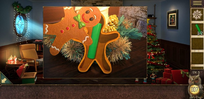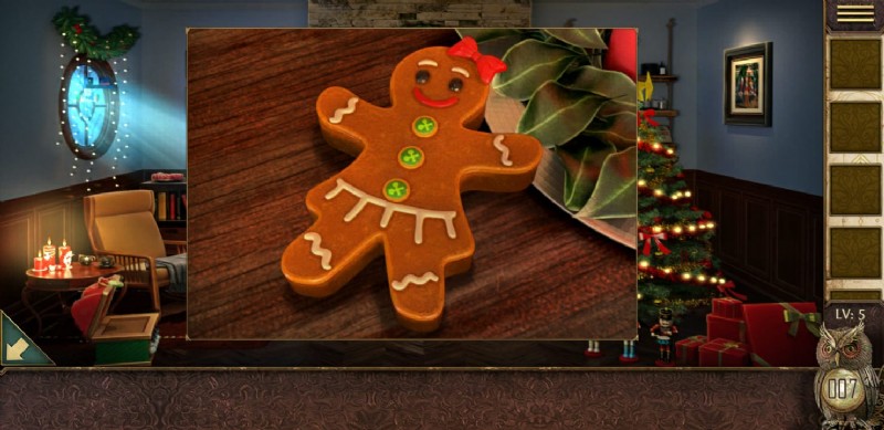 - 暖炉の棚のクッキーをタップ コードを追加します (325 ) キーを取得する .キーを使用してドアのロックを解除し、部屋 5 から脱出します。