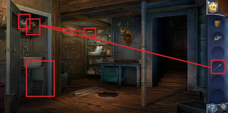 - トーチを選択し、シーン全体でライト エリアをドラッグして、銃を見つけます 、フィッシュ トロフィー 、キー 右側のダクトテープの近くに保管されている箱から。