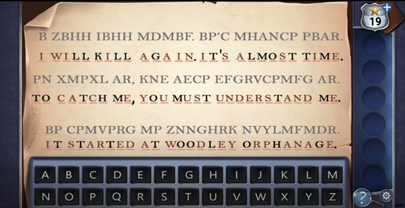前述のように、ケイト・グレイは空白の多い暗号化された手紙を受け取りました。正しいアルファベットを見つけて、キーボードを使って文章を完成させ、クリスマス キラーがあなたに何を言いたいかを確認してください。