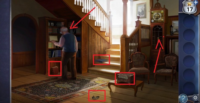 - 床をクリックして写真のスクラップを拾います 2 冊の本を見てください。1 冊は階段にあり、2 冊目は戸棚の近くにあります。