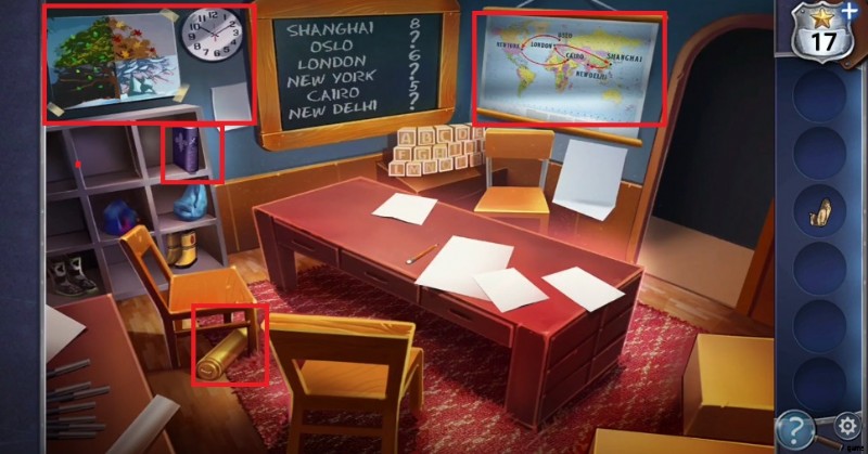 - 教室の左側に貼られたポスターを見て、文字盤をクリックし、端にある 4 つの異なる画像を一致させます。設定する必要がある画像は次のとおりです:Desert、Cart、Sand 錆びた木で 、雪。