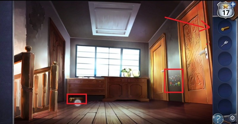 - ワードローブの下から 2 階に上がった後、時計の重りをつかみ、インベントリから鍵を選択して右側のドアを開きます。