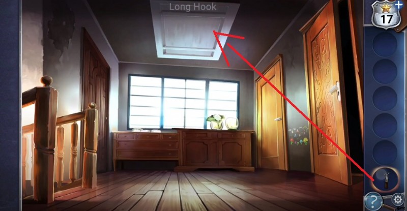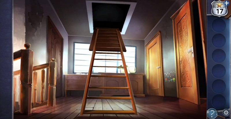 - 2 階に上がり、長いフックを使って天井からはしごを下ろします。次に、はしごをクリックして屋根裏に上がります。