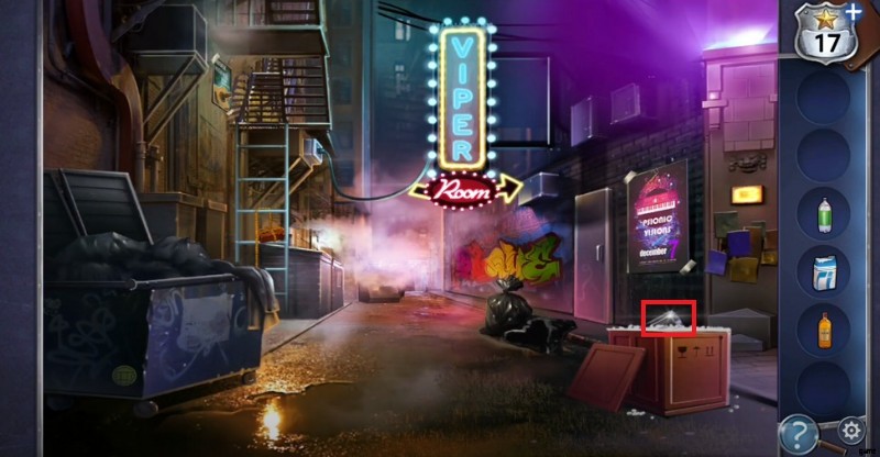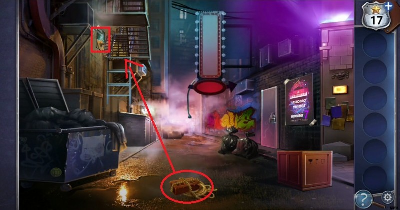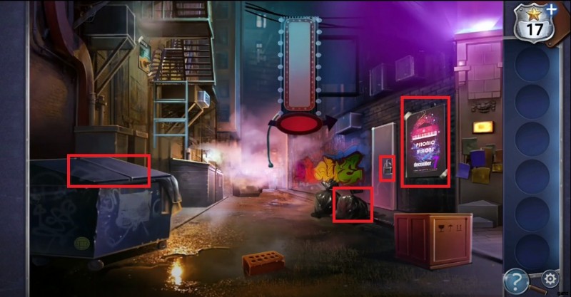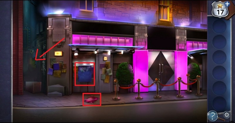 - 左側をクリックして、他の隠しオブジェクトがないかストリートを調べます。紫のポスターは右側の壁に貼られています。ポスターをクリックして数字の 7 を確認し、ゴミ箱に行ってロープを見つけてください。