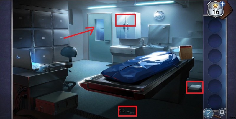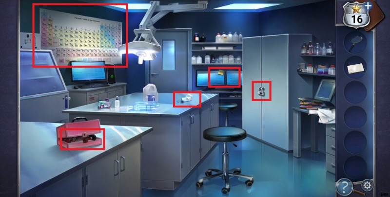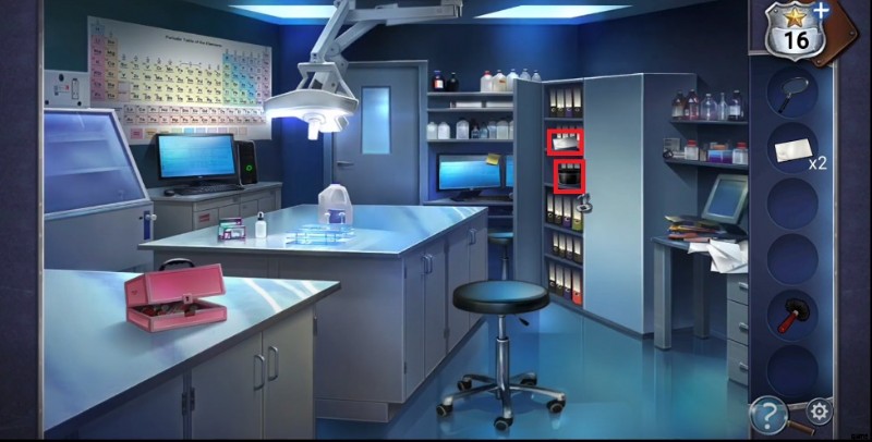 - ラボに到着したら、隠されたオブジェクトを発見してインベントリに追加する必要があります。まず、患者のベッドの鍵を見つけ、虫眼鏡を見つけなければなりません。あなたは食器棚を開けなければなりません。