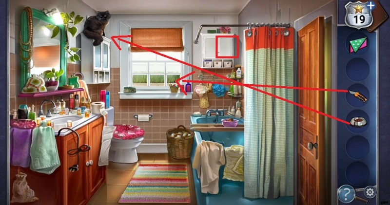 - 左側のドアを通ってバスルームに行き、隠しオブジェクトを見つけてゲームを進めてください。