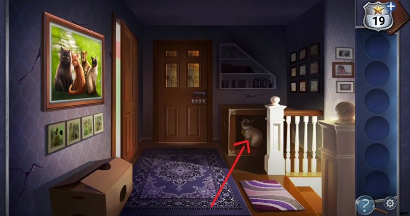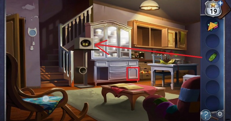 - バスルームを出て階下に行き、戸棚の左側にある箱に隠れている猫に草を食べさせます。