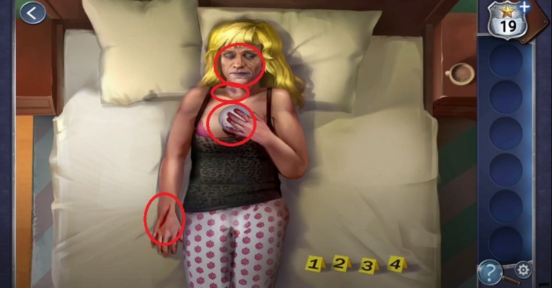 - 次に、毛布を持ち上げて遺体を調べ、次のような証拠を見つけ始めます。