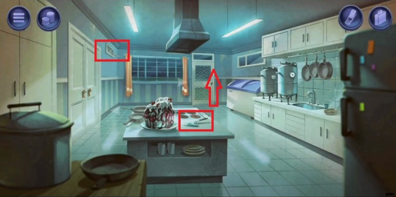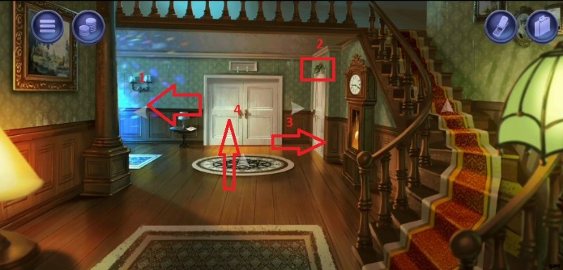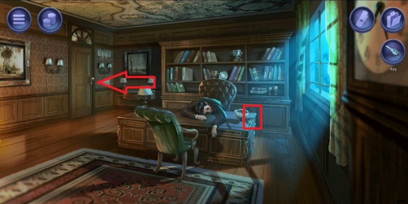 - パーティールームに行き、左側のテーブルにマッチ箱を置きます。ホールに戻り、2階を通って部屋に行き、鍵をテーブルの上に置きます.部屋を出て、2 番目の鍵を選択し、鍵をドアの下にスライドさせます。