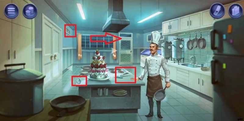 玄関先はキッチンで、チーフがすでにおいしい料理を作っています。ドアをクリックしてキッチンに入り、部屋を探索して必要なアイテムを見つけてください。