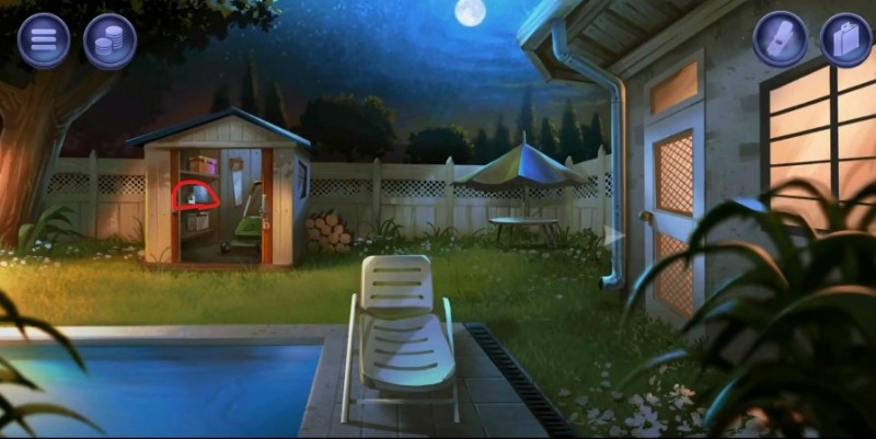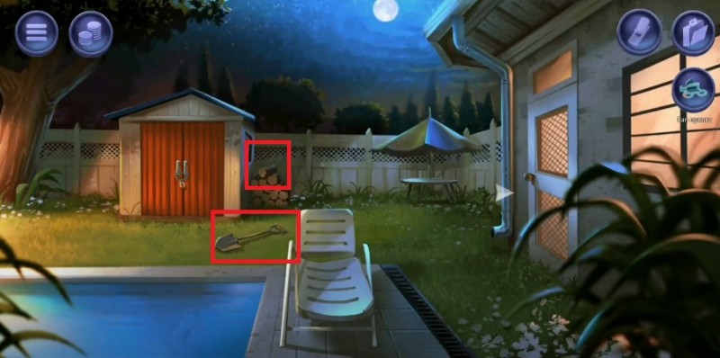 - キッチンに戻り、右側のドアを通り抜け、小さな小屋を叩いて、テーブルの上にある鍵を使ってロックを解除します。