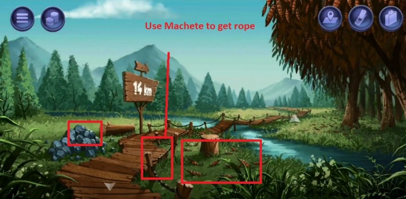 - 次に、インベントリを開いて Machete を選択します シーンからロープを取得するために使用します。