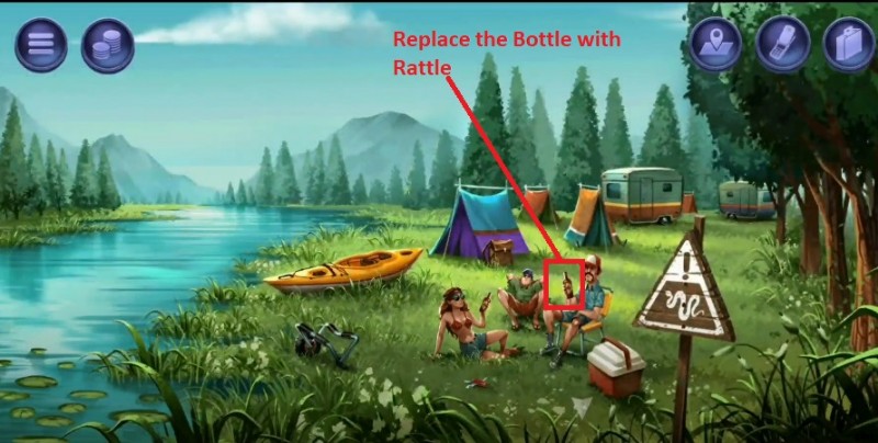 - あなたは今、3 人が飲み物を楽しんでいるキャンプ場にいます。 NPC との対話が可能です。ただし、ラトルを入手するには、インベントリを開いてビーン ポッドとボトルを混ぜる必要があります。 .