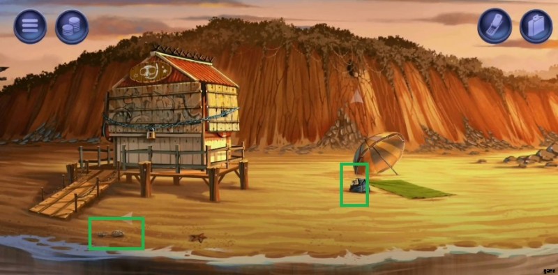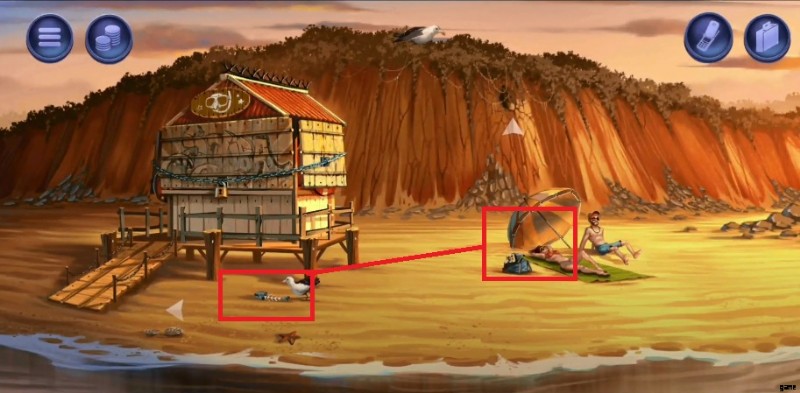 - 次に、上向きの矢印をクリックして、日光浴を楽しんでいるカップルを見つけます。家の砂をタップして魚の骨を集めます .