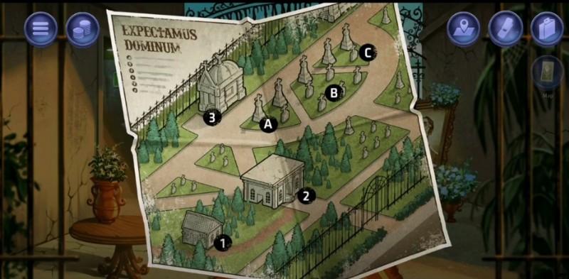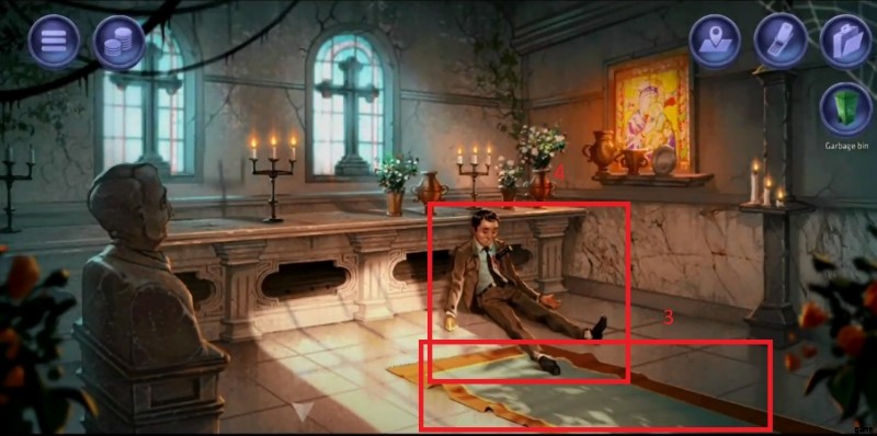 - 地図をクリック アルファベットを使用して場所のカテゴリを表示するには と数値 . 「3」をタップして教会を訪問 」 死体を見つける .