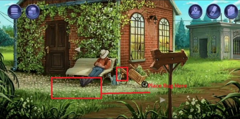- 持ち物に向かい、じゅうたんを選択し、農夫の足元の床に置き、鍵を入手します。 カートから .キーを使用してベンチの左側にあるドアを開き、ドアを通って家に入ります。