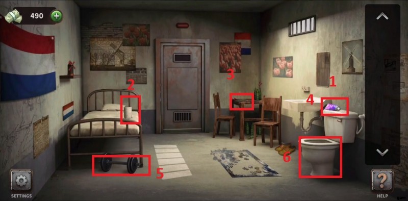 100 Doors:Escape from Prison Level 4 は、いくつかの隠しオブジェクトとやりがいのあるパズルが満載のダッチ セルで行われます。このゲームでは、「パズルをスキップ」と「ヒント」の両方の選択肢があります。パズルやミニゲームを解くのが難しいと感じた場合は、次の 2 つのオプションのいずれかを使用してヘルプを得るか、100 ドア:刑務所からの脱出チュートリアル を読んでください。 .