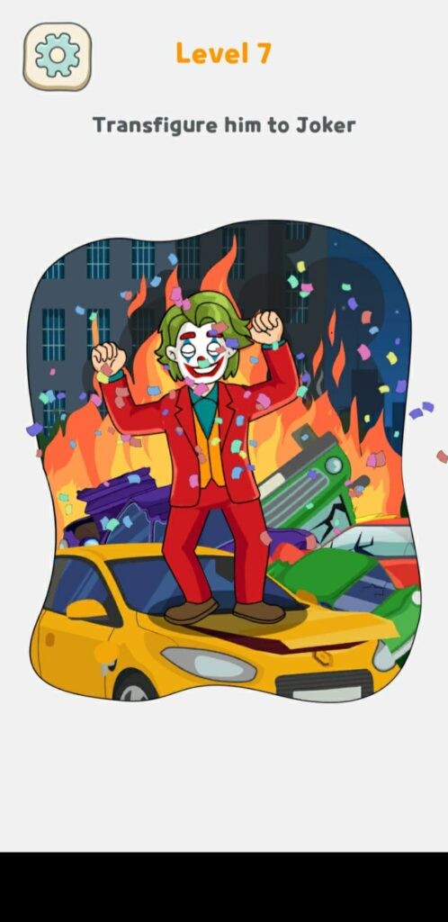 確かに、あなたはジョーカーの映画を見ました。はいの場合、Displace It Level 7 の解決策を見つけることは問題になりません。そうでなければ、その男をジョーカーに変えなければなりません。まず、スーツを男性にドラッグしてから、マスクで同じことを行います.