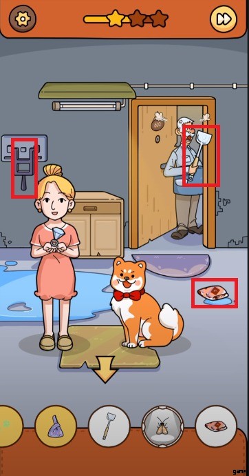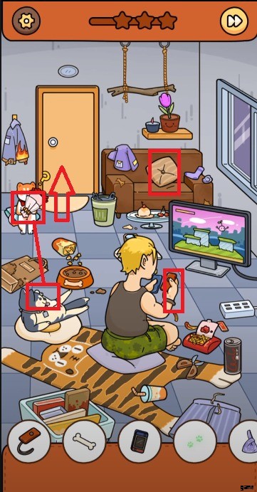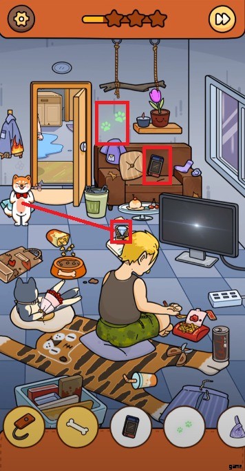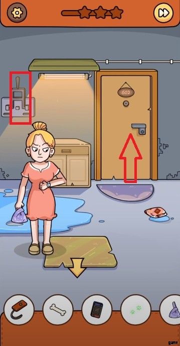 - 猫が 2 番目の部屋に着いたら、そこに行き、女の子がちょうど落としたハンドバッグを拾います。