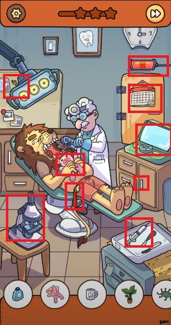 ライオンは定期検診のために歯医者の椅子に座っており、医者は歯を調べて問題を見つけています。医者が仕事をしている間に、隠しオブジェクトを見つけてリストを完成させてください。