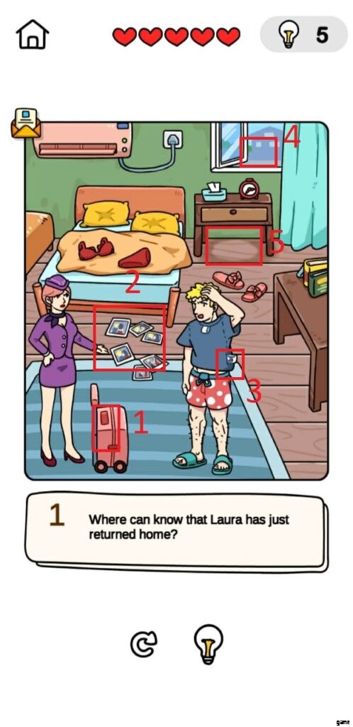 Brain Out Detective Level 3 は、カップルを中心に展開するため、非常に興味深いものです。プロットは、予期せず家に到着し、ボーイフレンドの秘密を発見したローラから始まります。ゲームは 3 つの質問をし、次の隠されたオブジェクトに答える必要があります。したがって、Find Out Detective Walkthrough に飛び込んで、すべての解決策と答えを見つけるのに役立ちます。質問を注意深く読んで回答し、レベルを完了するか、以下の解決策の画像を参照してください。