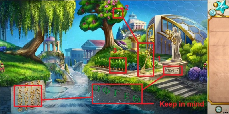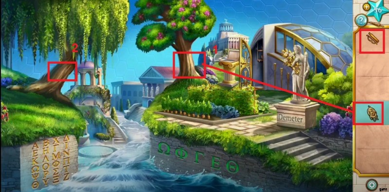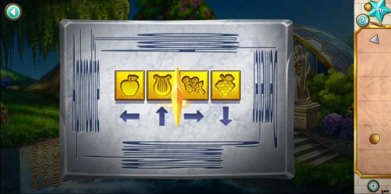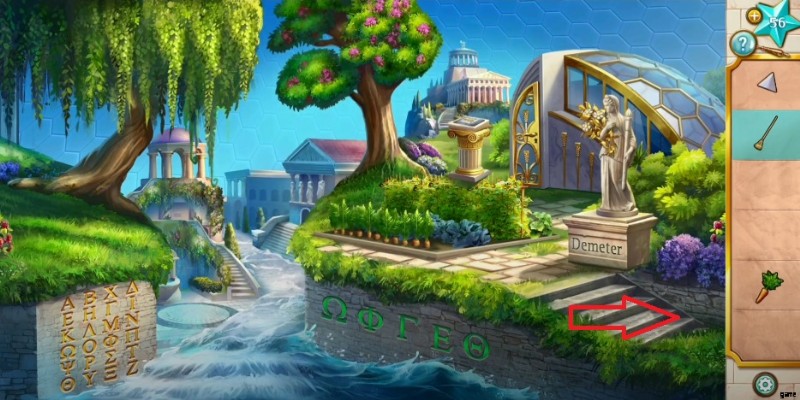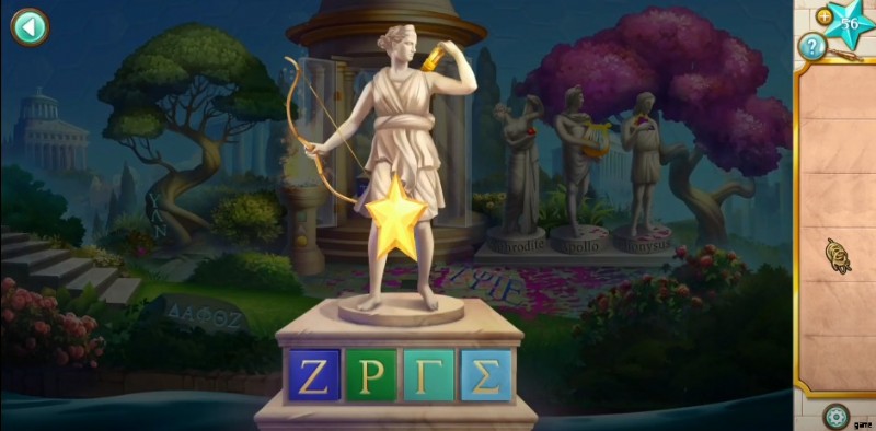 - 前のシーンで床、木、石、壁に印刷されたギリシャ文字を見つけて、手がかりを得て文字を正しく入力してください。完了したら、彫像から弓と矢を手に取り、インベントリに追加してください。