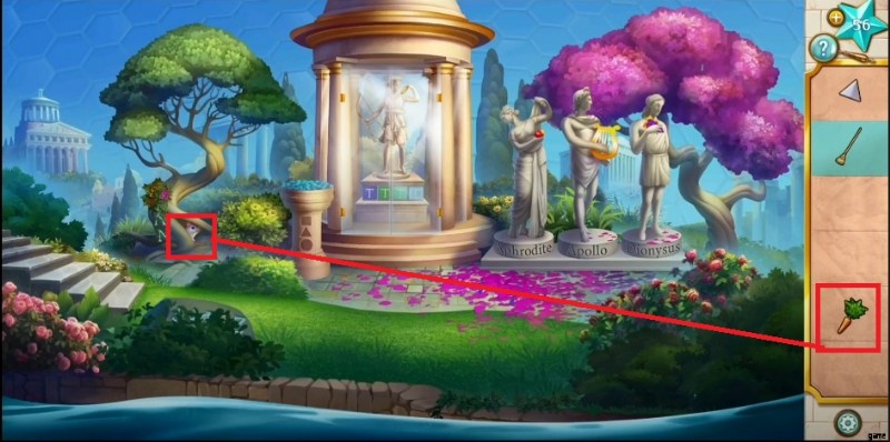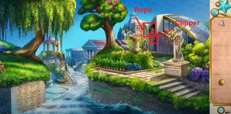 - ロープとクリッパーを集めたら、ガーデンに戻る必要があります。クリッパーを選択し、木の茂みを切って文字を見つけてください。