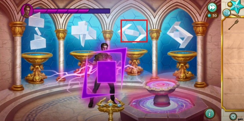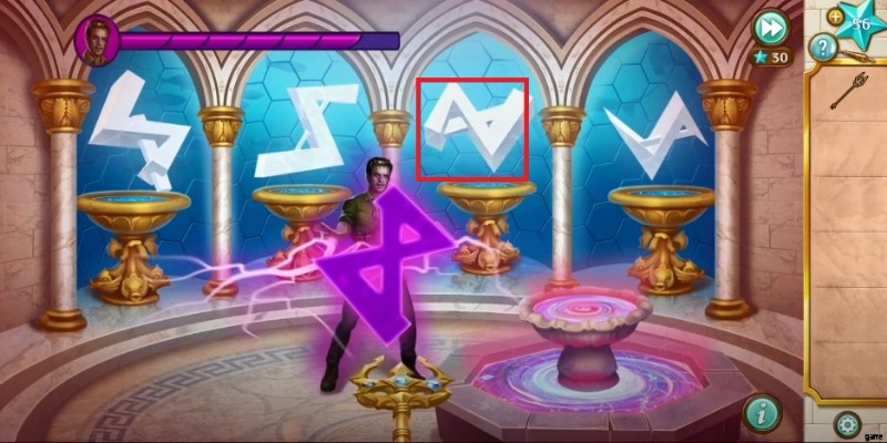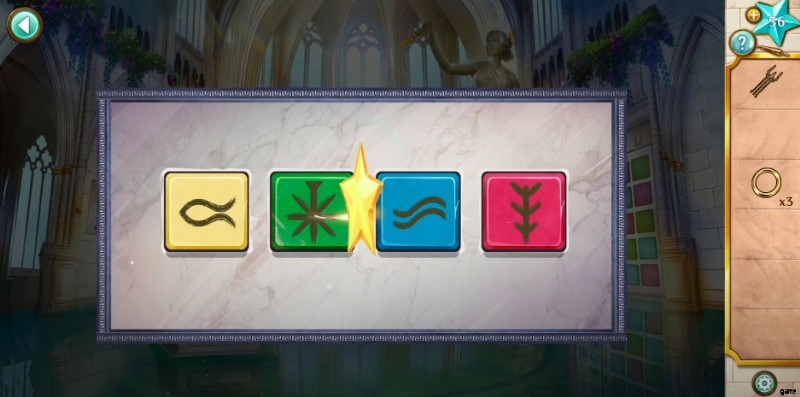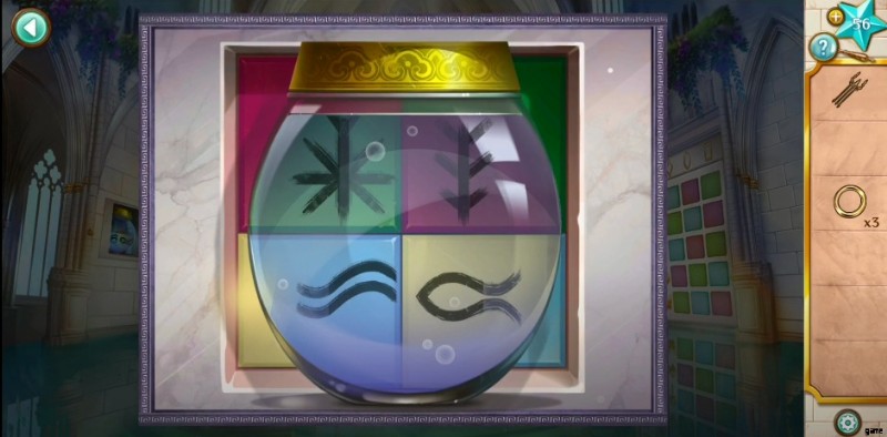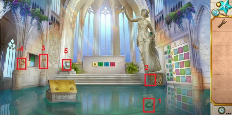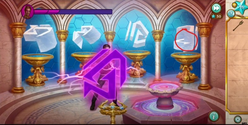 - さて、黄色のボタンが 4 つあるフロント エリアをタップします 、緑 、青 、赤いボタン .形を設定してロックを解除し、寺院の噴水を発見してください .