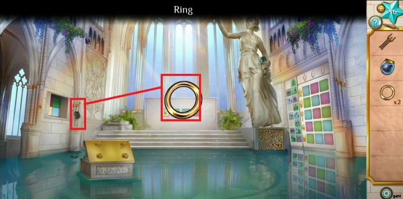 - 噴水をしばらく離れて、左側のボックスに向かいます。インベントリからすべてのリングを選択し、ボックスのカバーに配置して、別のパズルを明らかにします。パズルを解くには、たくさんのアトランティスのシンボルを見つけ出さなければなりません 噴水と表紙にも印刷されています。