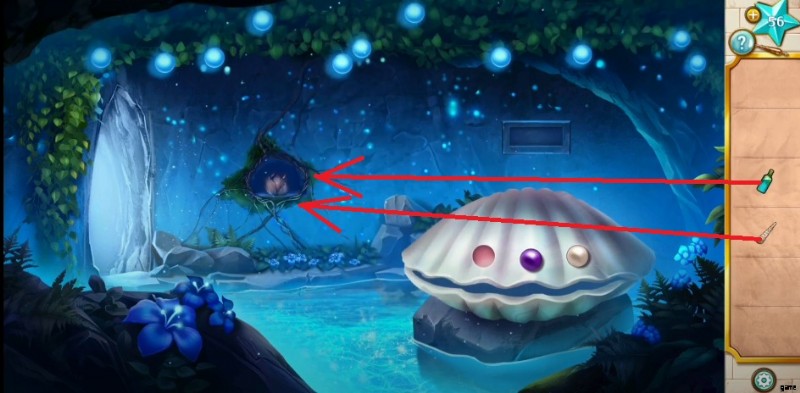 - 洞窟に入り、シェルにホワイト パールを置き、空のボトルに水を入れます。