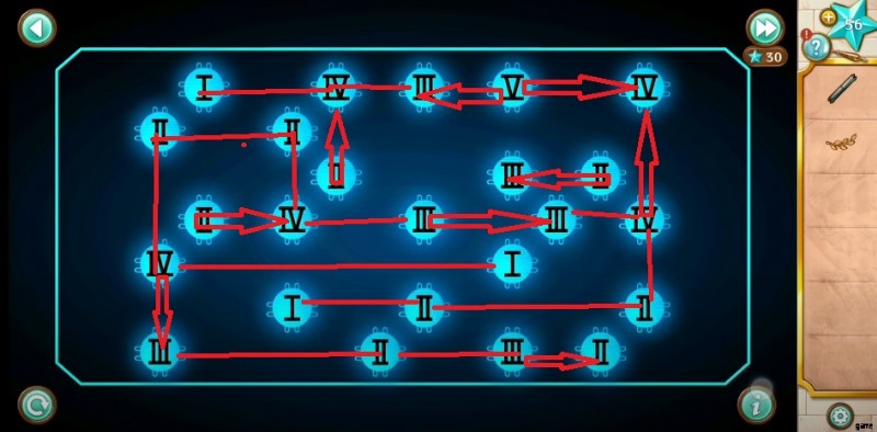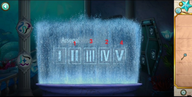 - 次に、右側のドアに向かい、アーセナルのドアをクリックして、ドットで特定の数字を見つけます。噴水に戻り、次の番号をタップします:I、IV、III、V。
