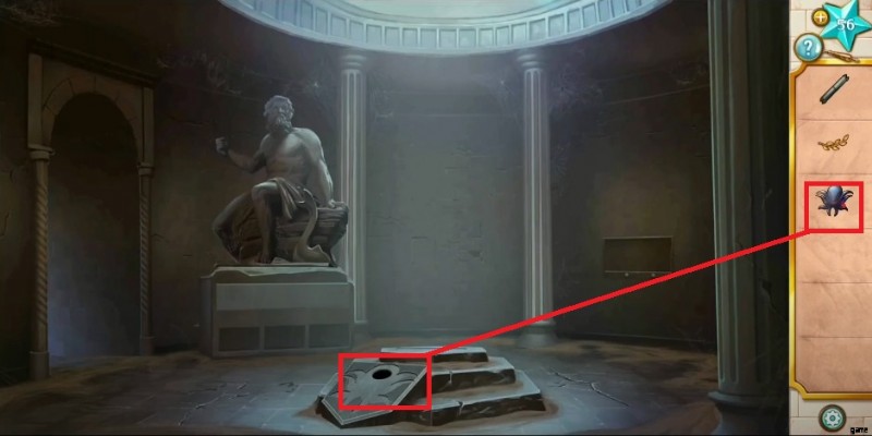- In the end, click the cabinet below the statue to open up its cover, head to your inventory, and place all objects (Shell , Olive Branch , and Scroll ) in the cabinet after selecting one by one. Before leaving the area, don’t forget to pick up Trident Piece.