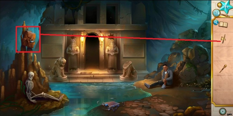 - Next, use the Warhammer from the inventory to get the bag from the height above the skeleton and crack the lock.