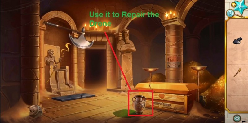 - At the start, pick up an Amphora of Oil from the ground and take it outside to Peter. Select the Amphora from your inventory and pour it on the Drone to repair it.