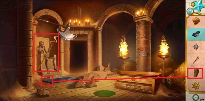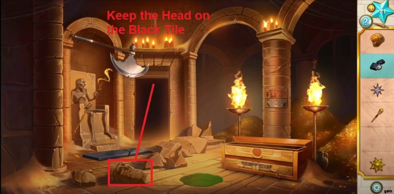 - Select the statue head from the inventory and place it on the black tile that in itself is a trap. Next, collect the Vintner Staff from the mummy and hit the back button to reach the previous room.