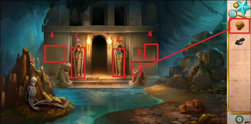 - Before leaving the temple, we’ve collected two objects and gave them statues on the left side. Now, there are two other sticks available that you must offer to the figures on the right side, as shown in the image given below.