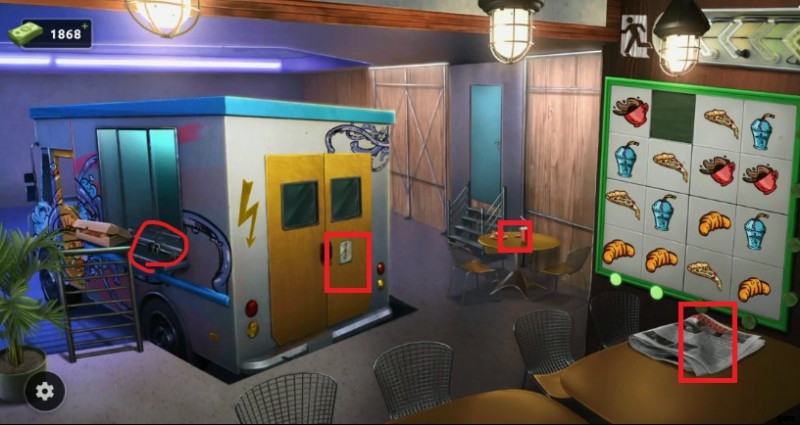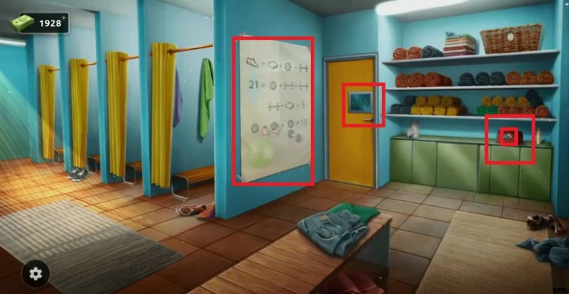 - まず、右側の赤いボックスをタップして、紙の手がかりを拾います。 それから。赤い箱を出る前に、イメージを念頭に置いて、ポスターが貼られている壁に向かいましょう。